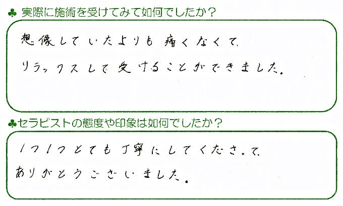 想像していたよりも痛くなくて、リラックスして受けることができました。