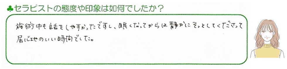 施術中も話をしやすかったですし、眠くなってからは静かにそっとしてくださって居心地のいい時間でした。