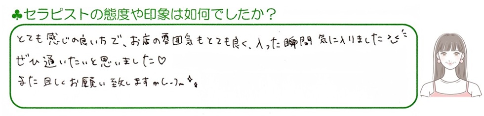 話し方も優しくて、気付いたら寝てしまうぐらい 心地良かったです。 色んな事教えていただきました。 ありがとうございました。
